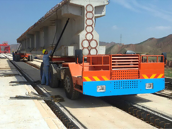 運梁車,又稱運梁平車、運梁炮車、炮車,是將在預制廠或橋梁現場預制的鋼筋混凝土梁橋橋面板運送到架橋機的專用車輛。本車具有載重量大、自行式、運輸不受距離限制。性能可靠,安全設施齊全,整機結構合理,運轉平穩,操作舒適,制造成本相對較低,維修方便,抗傾覆穩定性好,生產效率高等特點。操作簡單方便,操作司機只需簡單的培訓即可勝任。維修方便,配件都屬于國標件。